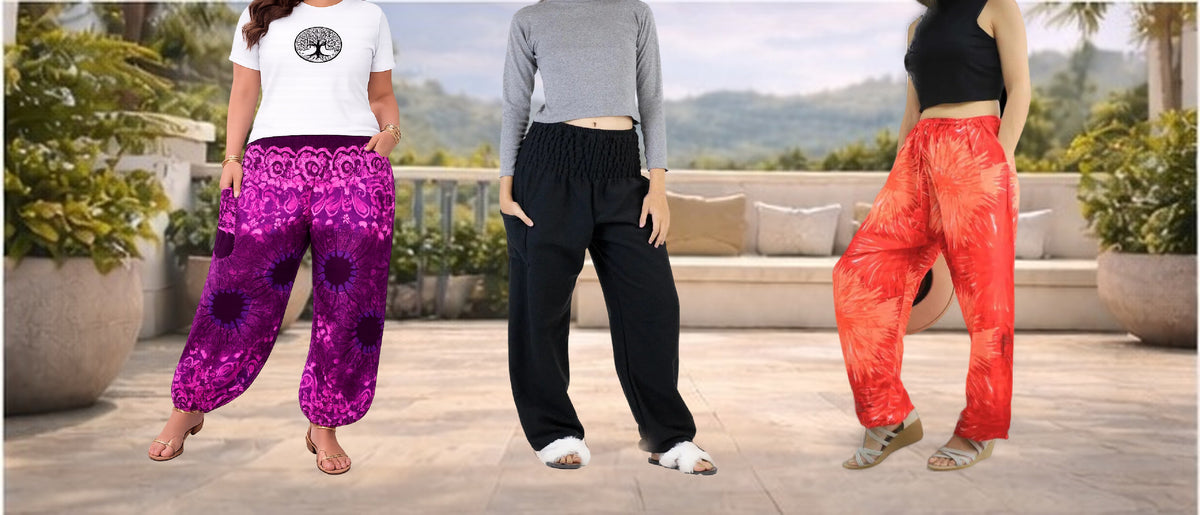 Our harem pants are made primarily from Royal Thai Rayon and other high-quality, airy fabrics that ensure comfort and durability. We are committed to using sustainable and ethically sourced materials in all our products.
